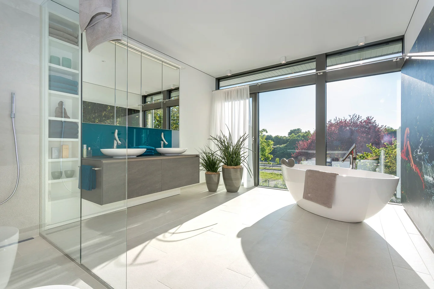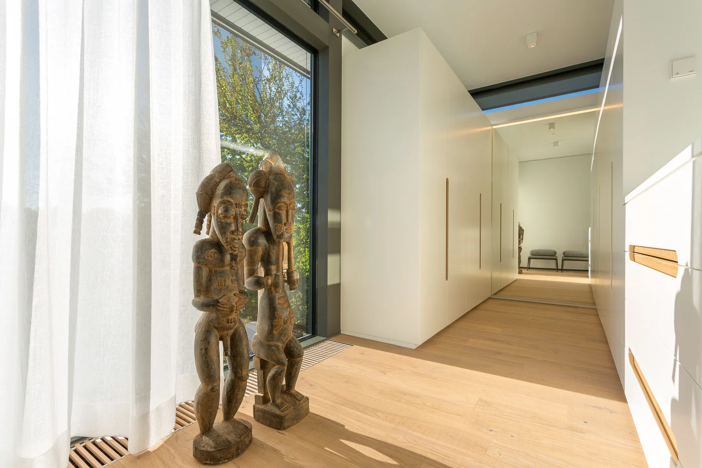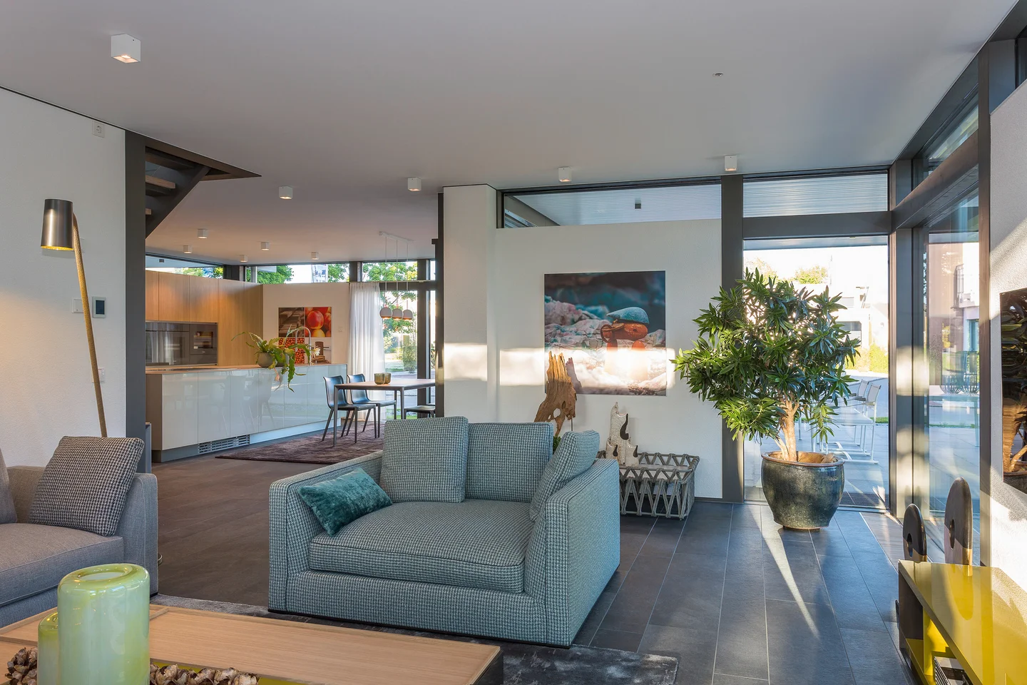 Mit viel Liebe zum Detail wurde die Inneneinrichtung dieses Hauses entworfen, dessen Grundthema das Zusammenspiel der Einrichtung mit der umgebenden Natur ist. Durch die moderne Architektur mit vielen bodentiefen Verglasungen, dem offenen Grundriss und die Verwendung natürlicher Materialien, deren Texturen und Farben die Natur ins Haus holen, ergibt sich das angenehme Gefühl mit den Jahreszeiten zu leben.