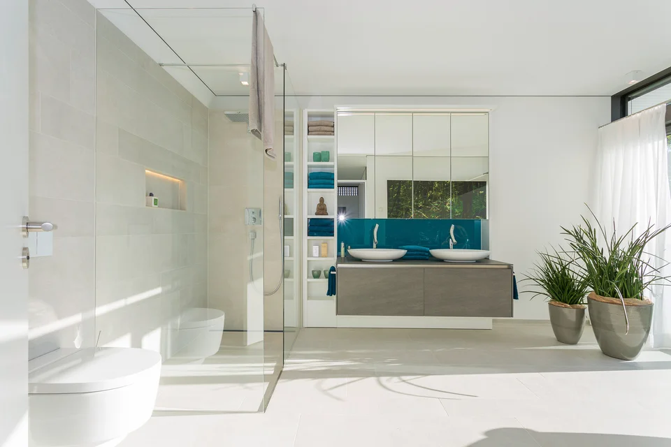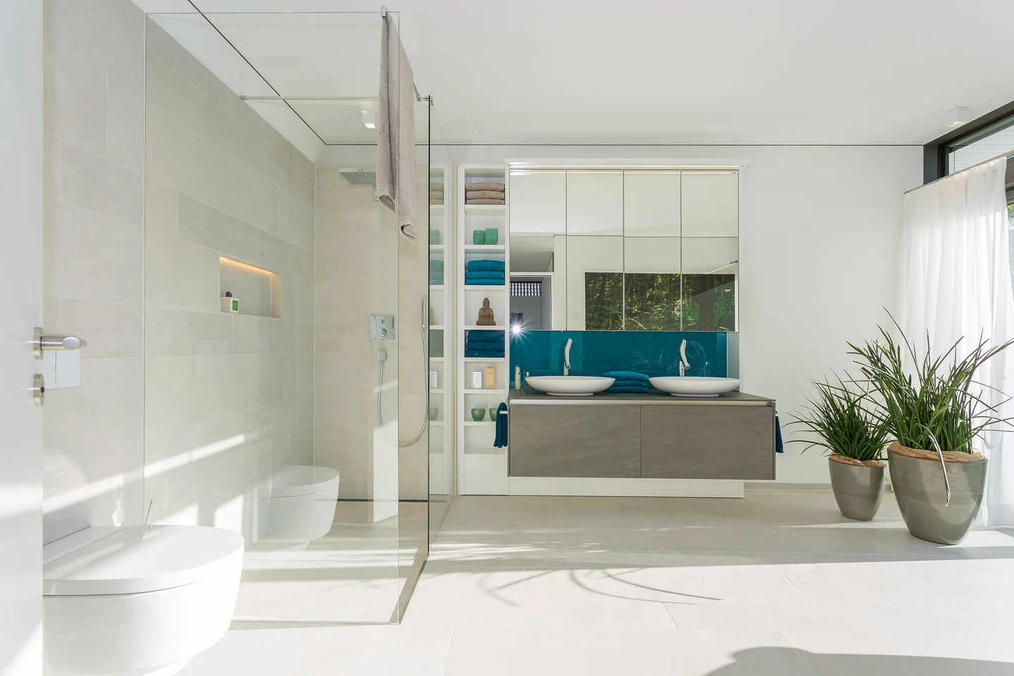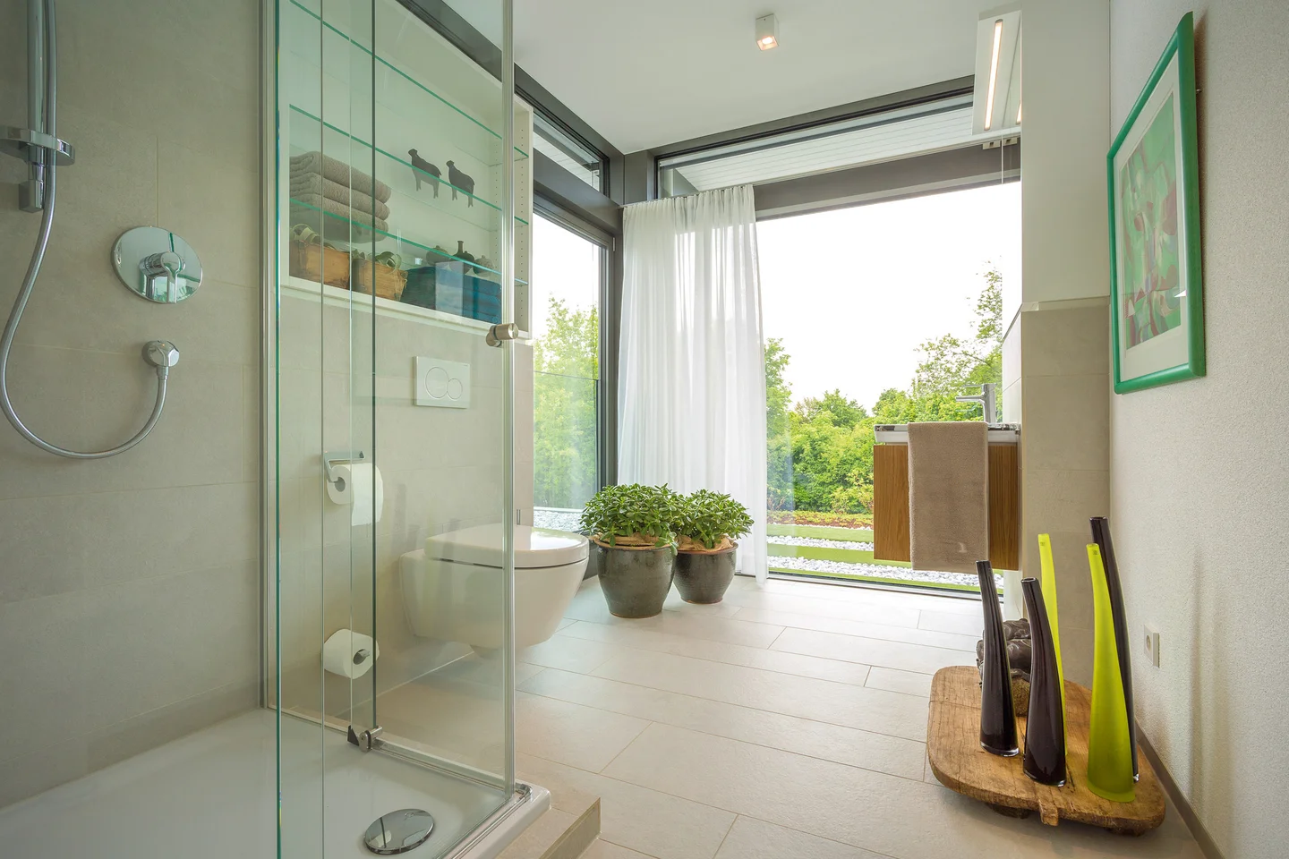 Mit viel Liebe zum Detail wurde die Inneneinrichtung dieses Hauses entworfen, dessen Grundthema das Zusammenspiel der Einrichtung mit der umgebenden Natur ist. Durch die moderne Architektur mit vielen bodentiefen Verglasungen, dem offenen Grundriss und die Verwendung natürlicher Materialien, deren Texturen und Farben die Natur ins Haus holen, ergibt sich das angenehme Gefühl mit den Jahreszeiten zu leben.