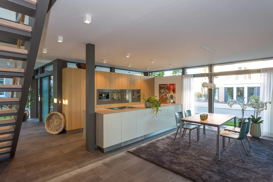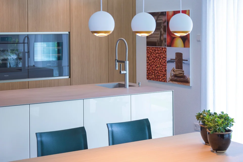 Die Küche mit edlen Holzfronten setzt warme Akzente zum kühlen Fliesenlook und sorgt für eine warme Atmosphäre.